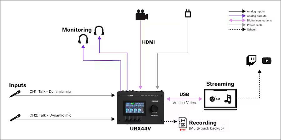 この構成は、URX44Vのオーディオ入力とHDMI入力を活用し、少人数での動画・音声コンテンツ制作に対応するセットアップです。