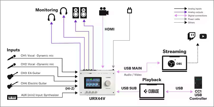 ダイナミックマイク、アコギ、エレキギター、シンセサイザーをURX44Vに入力し、カメラ映像はHDMIで取り込みます。