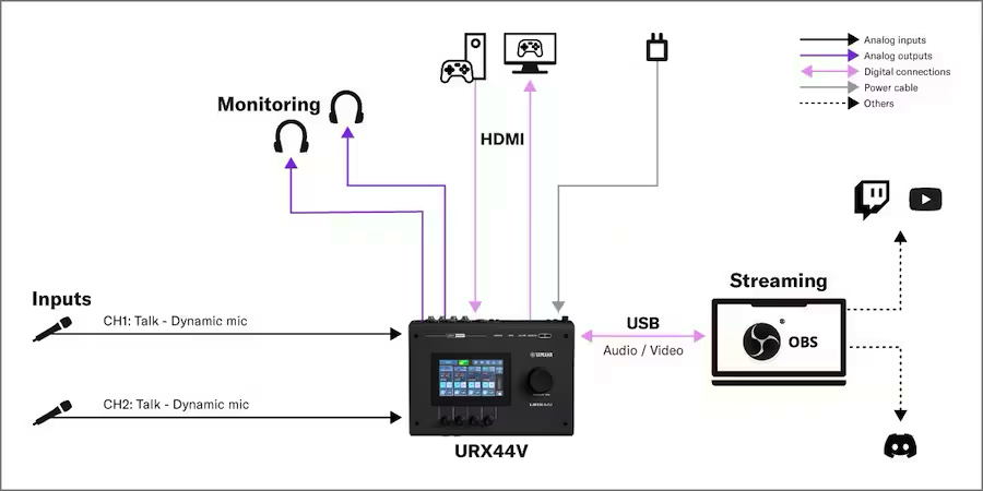 この構成は、URX44Vを使用して、ゲーム映像と実況音声をまとめて配信するためのセットアップです。