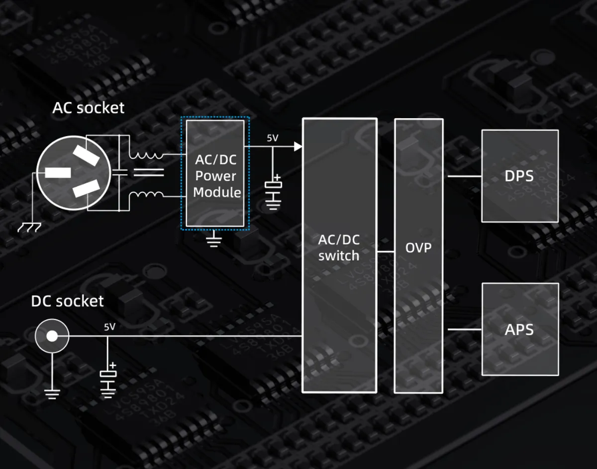 クリーンな電力を供給する高品質スイッチング電源を内蔵。また、外部DC電源ポート(※)も搭載しており、より高性能なリニア電源と組み合わせて使用することで、異なるサウンドパフォーマンスを体験できます。
