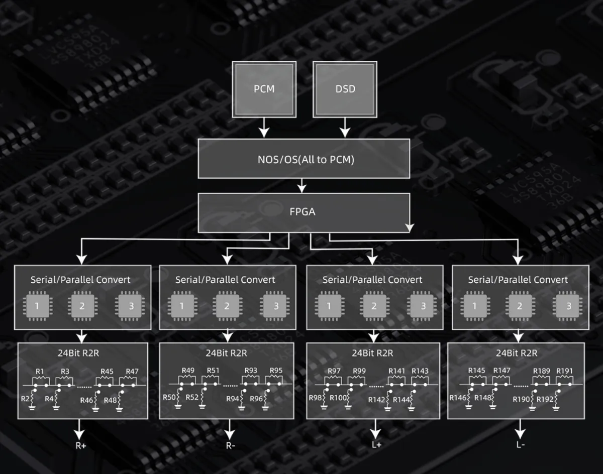 FIIO独自開発の4チャンネルフルバランス24bit R2R DACを搭載。チャンネルあたり48個、合計192個の高精度薄膜抵抗器(精度0.1%、温度ドリフト30ppm)で構成されています。