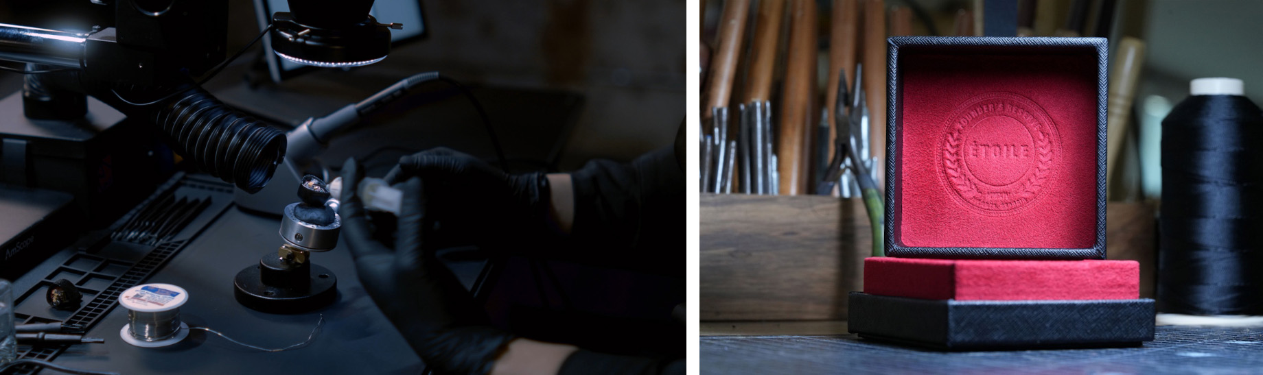 ETOILEは、一台一台丁寧に緻密な手作業で組み立てられています。付属するキャリングケースにおいても、イタリア製サフィアーノレザーとゴヤレッドアルカンターラを用いて手作業で製作されています。由緒ある伝統と緻密な洗練さをもって選ばれたこれらの素材は、ETOILEのフェイスプレートからケースへとシームレスに流れ、芸術性と精密さの途切れることなき糸を表しています。