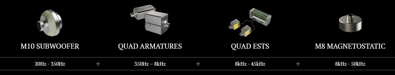 ドライバー構成 | 超低域-低域:「M10」ダイナミックドライバー×1 中域~中高域:Sonion製デュアルダイアフラムBAドライバー×2 中高域:Sonion製シングルダイアフラムBAドライバー×2 高域-超高域:Sonion製超薄型帯電ダイアフラムEST(静電)ドライバー×4 高域-超高域:「M8」MST(静磁)ドライバー×1 |