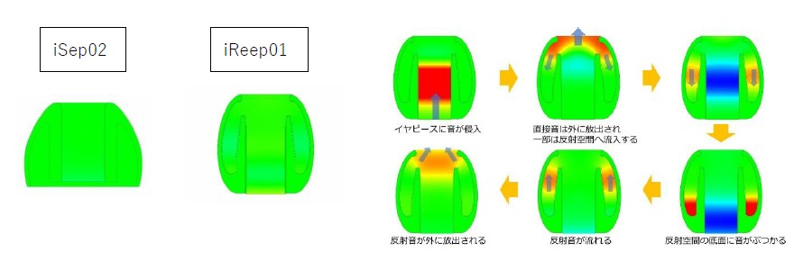 持ち運びしやすいキャリングポーチの他、MAPro1000 IIには硬度を再調整したスタンダードのシリコンイヤーピース「iSep02」に加えて、音の変化を楽しめるサラウンドイヤーピース「iReep01」が付属します。iReep01は、従来のホームオーディオにおけるサラウンド技術やライブハウスの臨場感に注目して開発したシリコンイヤーピースです。人間は左右の耳に届く音のズレ(距離や音量、位相のズレなど)を認識して音の方向を把握しています。故に擬似的サラウンドを得るためには、イヤホンから出る直接音と、僅かに遅延時間を持たせた反射音を重畳して放出し、人の耳に空間を感じさせることが必要であるという結論に至りました。そこでiReep01ではイヤーピース内部で効果的な反射音を作ることを目的としました。ドライバーから放出されて直接耳に入る音と、反射して耳に到達する音が重畳されることにより、聴感上の遅延を感じて広いサウンドステージと臨場感を感じることができます。ステレオモニター用のiSep02、ゲームなどでサラウンド感の味付けが欲しい方向けのiReep01、2種類のイヤーピースでシーンに併せてご使用頂けます。