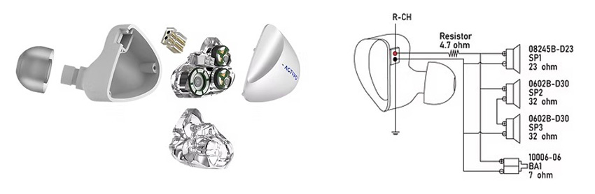 | ドライバー構成 | フルレンジ:8mm径ダイナミックドライバー×1 低域~中高域:6mm径ダイナミックドライバー×2 中域~高域:BAドライバー×2 |