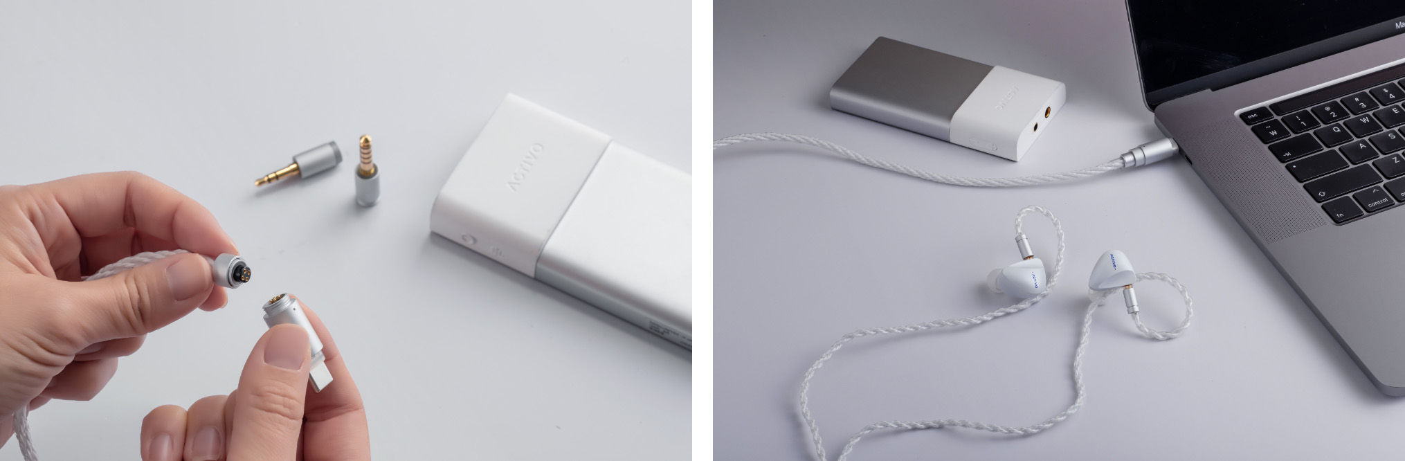 SCOOPのプラグ部には、3.5mmアンバランスと4.4mmバランスに加え、384KHz/24bit UAC2.0対応のUSB Type-Cへの切り替えが可能な、3in1マルチプラグを採用しています。ポータブルオーディオプレーヤーはもとより、イヤホンジャックがないスマートフォンやタブレットPCでもUSB Type-Cで接続することで使用することが可能です。