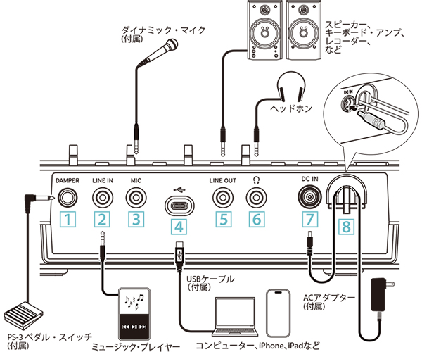 | 付属品 | ACアダプター、譜面立て、ペダル・スイッチ(PS-3)、マイク、マイク・スタンド(アーム、ホルダー、クランプ)、保護シート、マイク・ケーブル(XLR-ステレオ・ミニ・プラグ)、USBケーブル(Type-C)、クイック・スタート・ガイド、「マイク・スタンドを使うときは」(説明書)、ライセンス・カード |