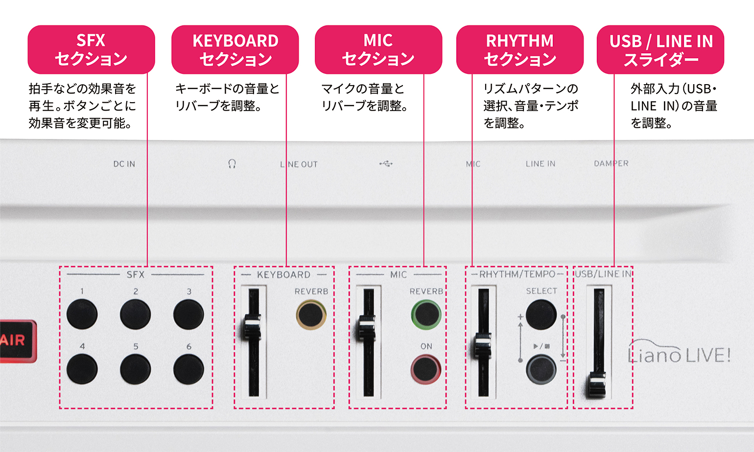 鍵盤とマイクにはリバーブを3段階で個別に設定可能。演奏にも歌声にも、それぞれちょうど良いリバーブを加えることができます。