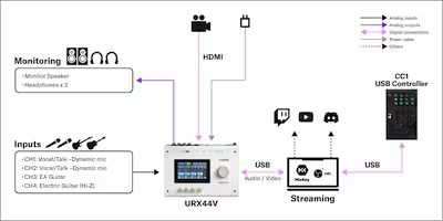 URX44Vがボーカル、トーク用マイク、ギターなどの音声をまとめて処理し、USB経由でMixKeyやOBSなどの配信ソフトへ送ります。