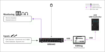 このセットアップでは、URX44Cを用いてナレーション音声やトークバック音声を高品位に収録し、そのままMixKeyやNuendoといった編集ソフトに取り込みます。