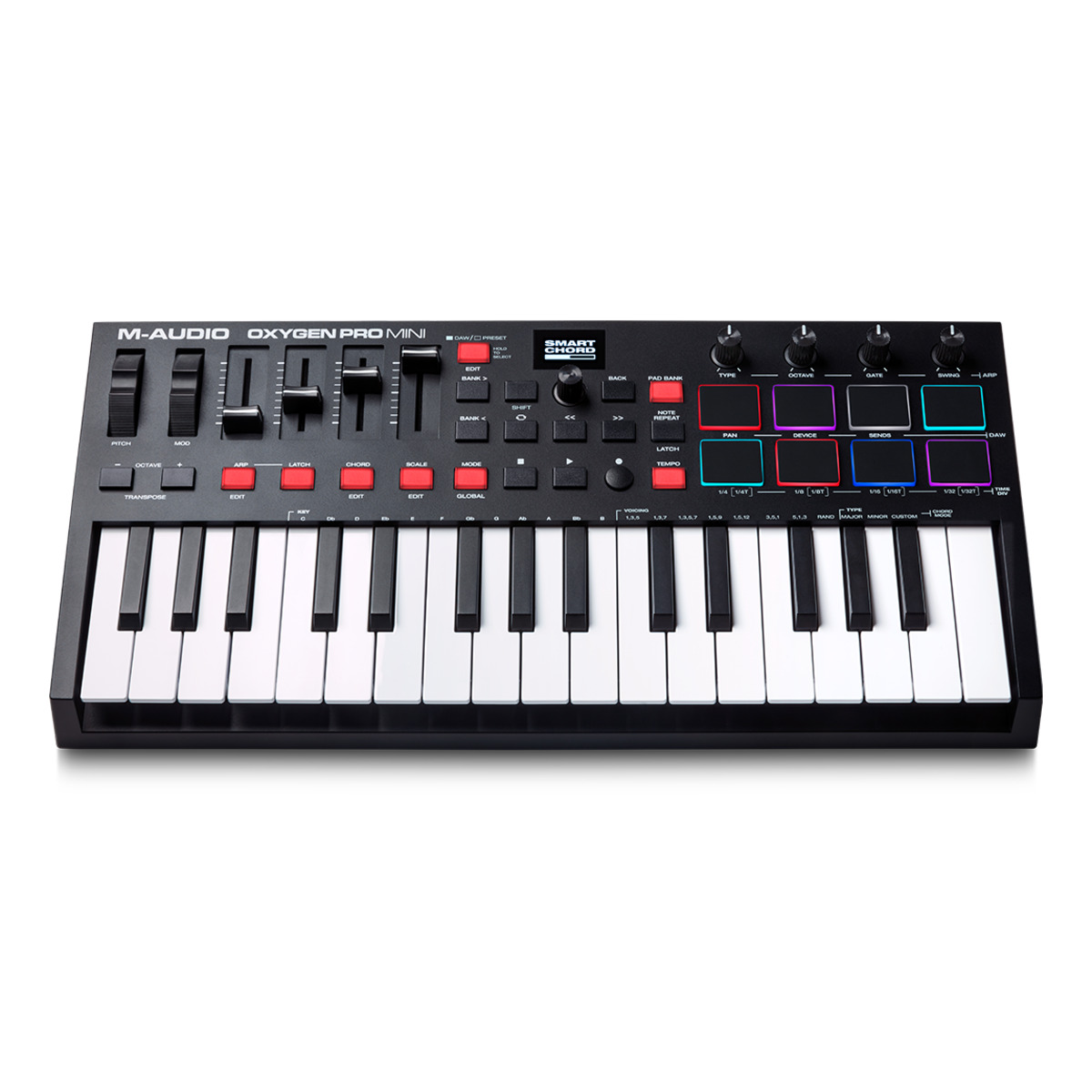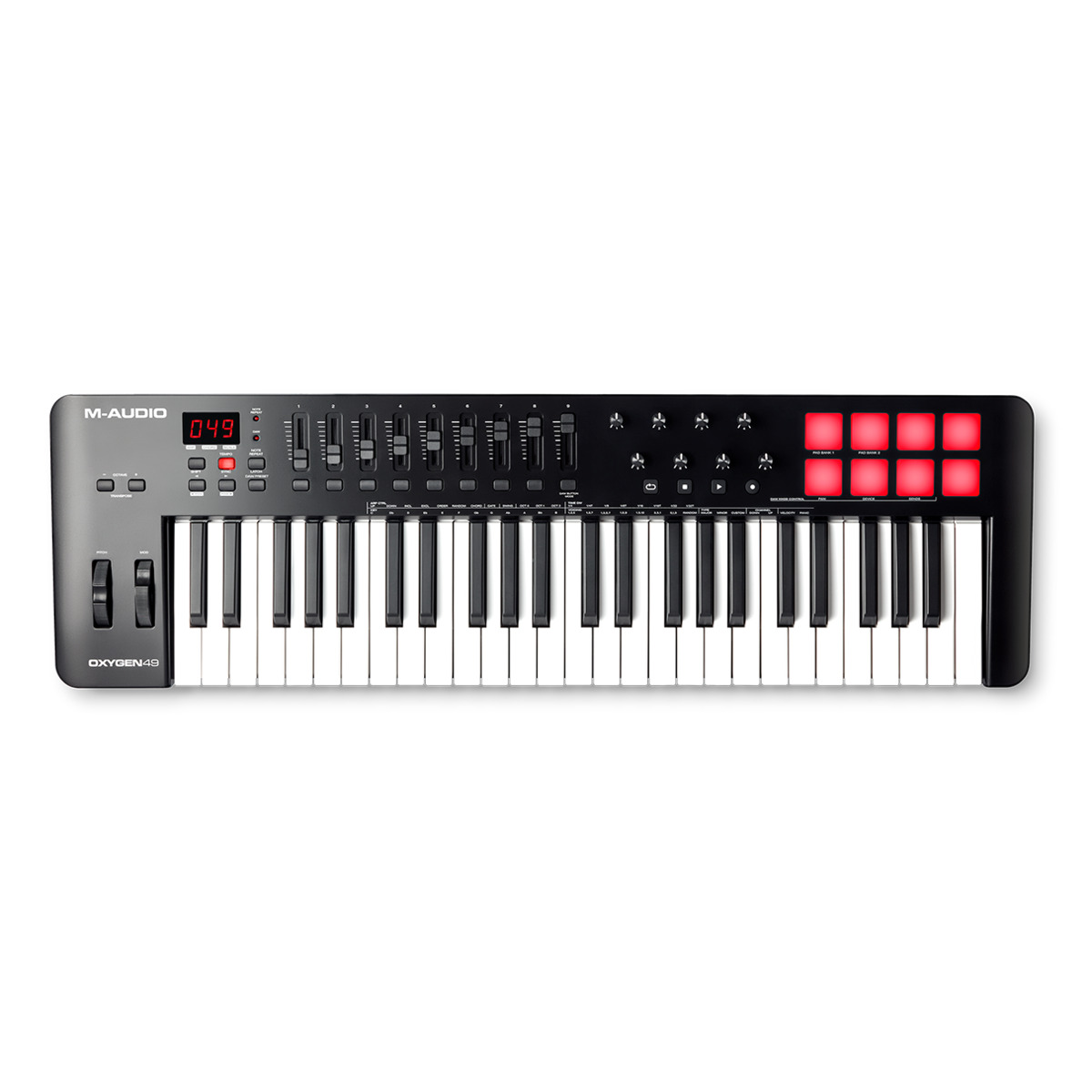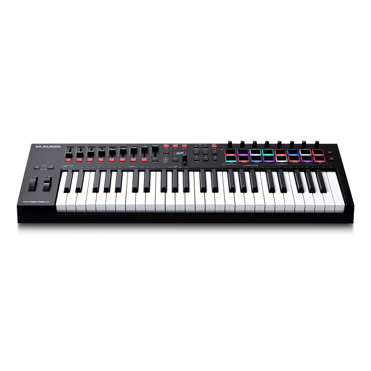 M-Audio Oxygen Pro 61は、クラス最高水準のベロシティ/アフタータッチ対応の61鍵セミウェイトキーボードを搭載しています。また、アサイナブル・アルペジエーター、ノートリピート機能に対応した8個のRGBバックライト付き、ベロシティ対応/アサイナブル・パッド、4つのアサイナブルノブ、9つのアサイナブルフェーダーを搭載。また、付属のバーチャル・インストゥルメントとDAWソフトウェアを最大限に活用するために必要な機能が揃っています。