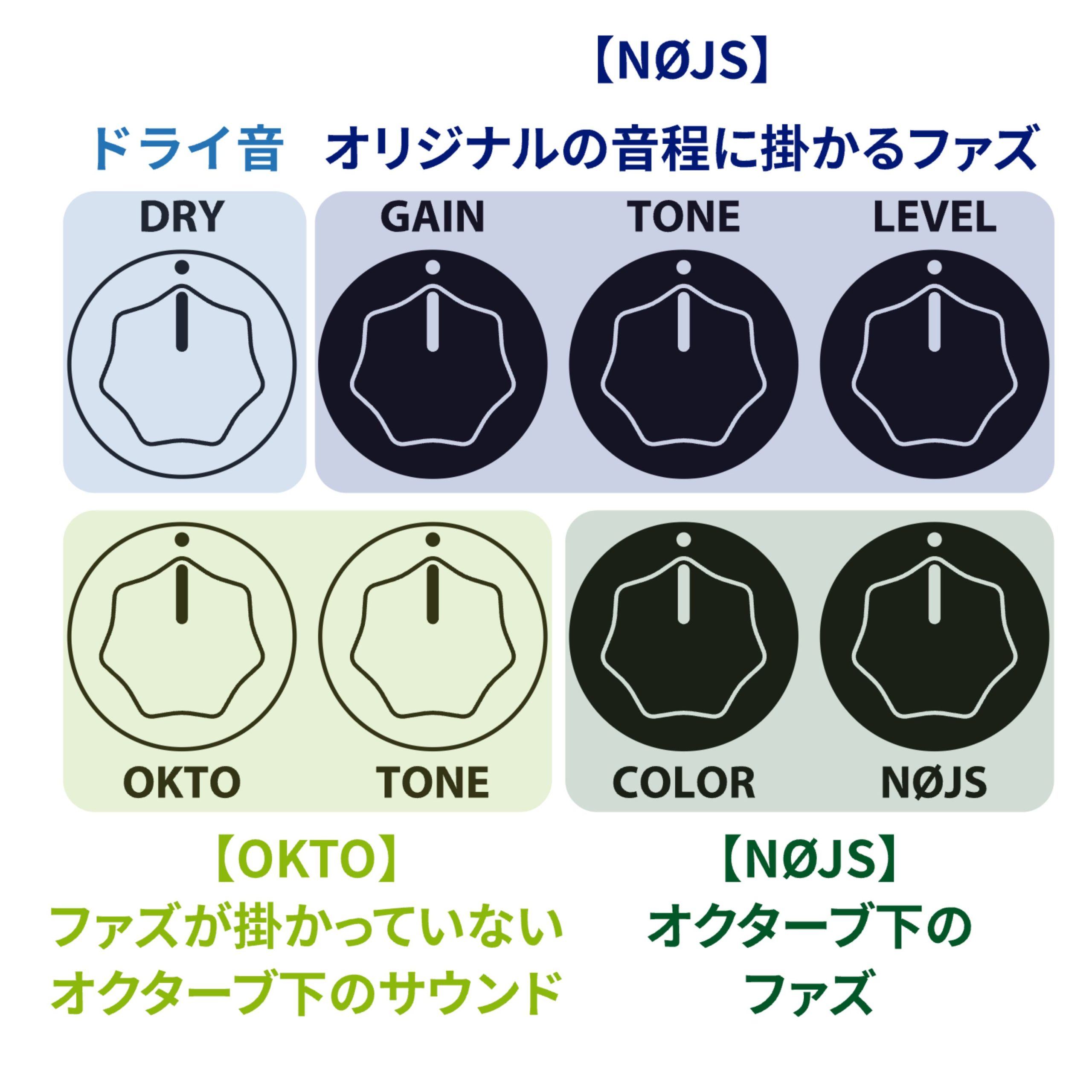 オクターバー〈OKTO〉とファズ〈NØJS〉が合体しました。OKTOはとても正確で素早く追従するオクターバー、NØJSはオクターブ・ファズです。