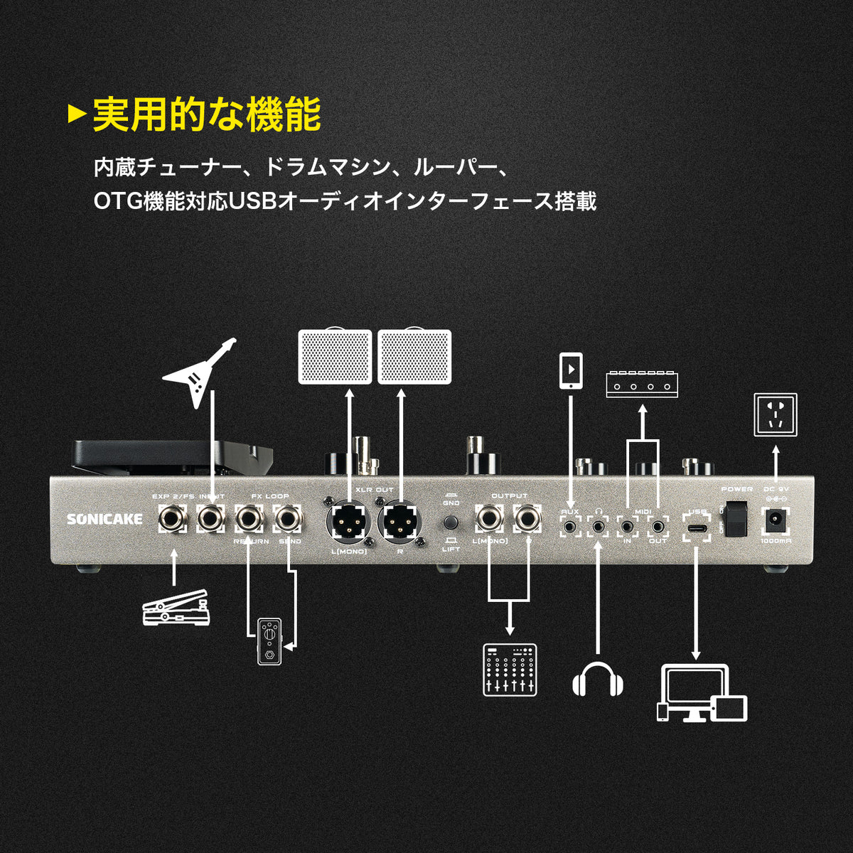 | アナログ入力端子 | ギター入力: 1/4" アンバランス(TS) 入力インピーダンス: 4.7 MΩ(A.GT)、1 MΩ(E.GT)、 10kΩ(LINE) リターン入力: 1/4" アンバランス(TS) リターン入力インピーダンス: 100kΩ AUX入力: 1/8" ステレオ(TRS) AUX入力インピーダンス: 10kΩ |
