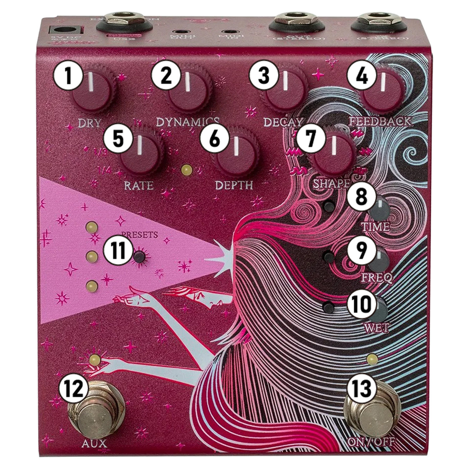 AUXスイッチはモードを切り替えることで、タップテンポ、リバーブホールド、プリセット切り替えが可能に。EXPコントロールは全てのノブに割り当てることができ、フットコントロールの自由度を拡張しています。