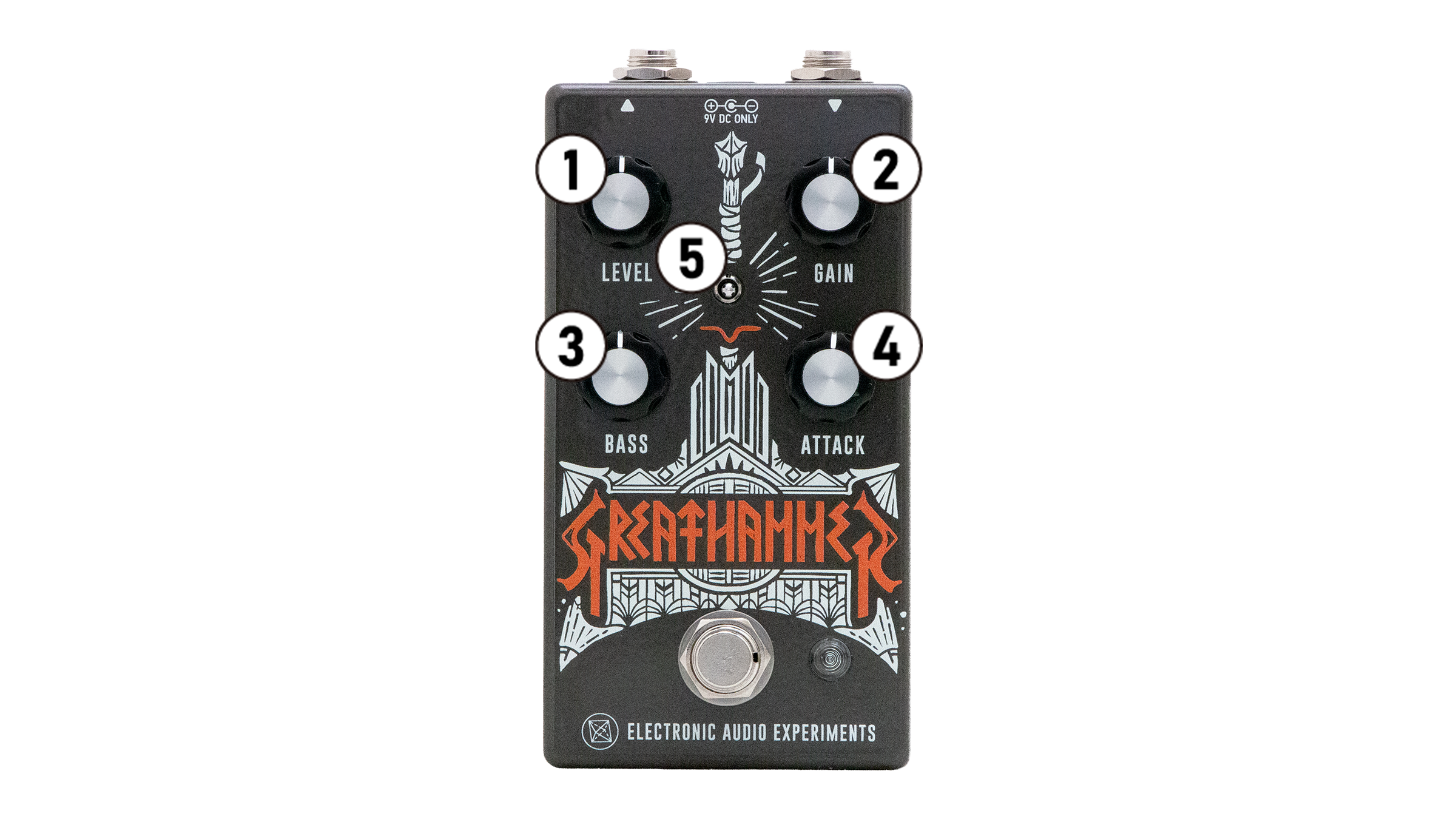 Greathammerではこれを解消すべく、クリッピング段より前に配置されるトーンコントロール”Attack”と、後ろに配置される低域のブーストコントロール”Bass”を備えています。これによってブライトで硬質なドライブをAttackで、獰猛でたっぷりとしたローエンドをBassで同時に実現することができるのです。