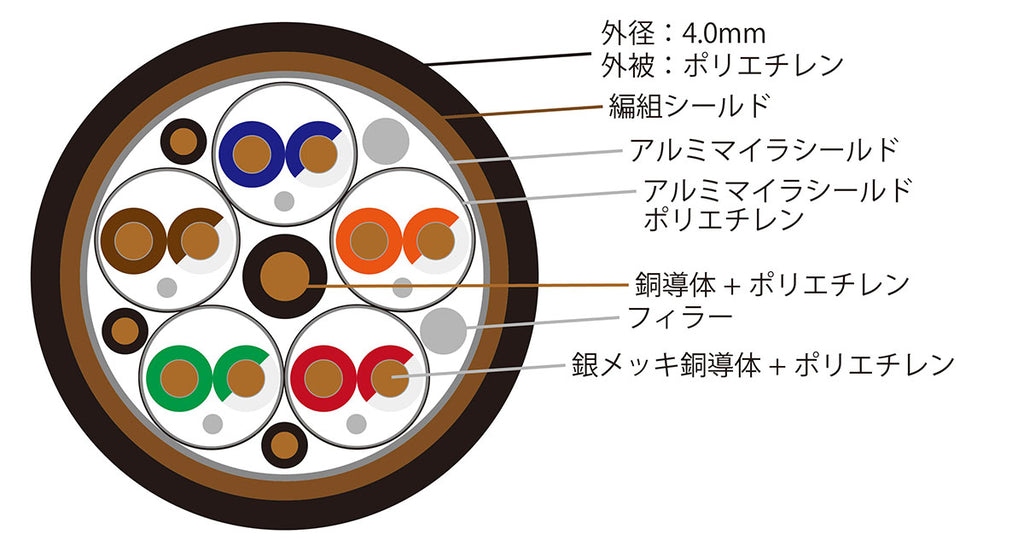 | 構造 | 銀メッキ銅線ツイストペア5対、銅線5芯 |