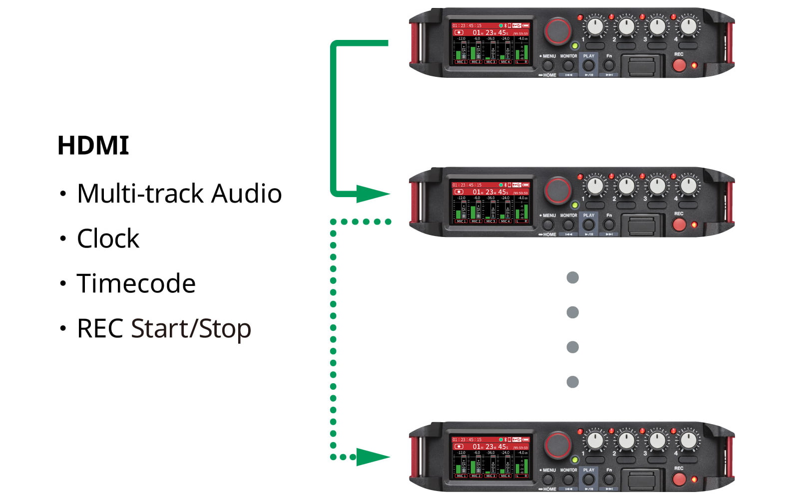 複数台の『FR-AV4』をHDMIで接続すれば、カスケード動作が可能になります。クロックやタイムコード同期のほか、マスターとなる1台目の操作で録音の開始・停止をコントロールできます。