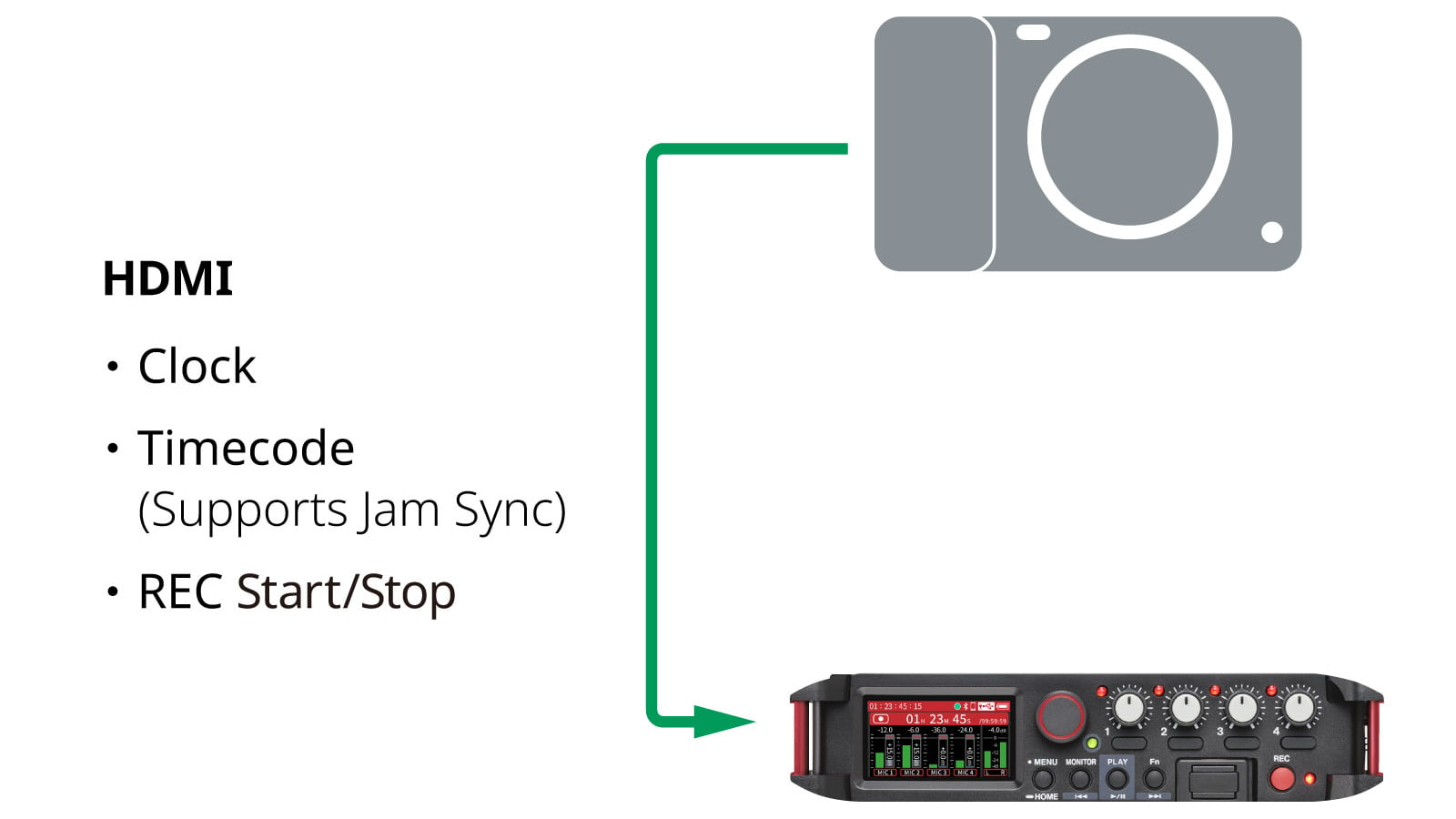 『FR-AV4』とカメラをHDMI接続するだけで、映像と音声の高精度なクロック同期が可能です。カメラの操作に連動して録音が開始・停止されます。