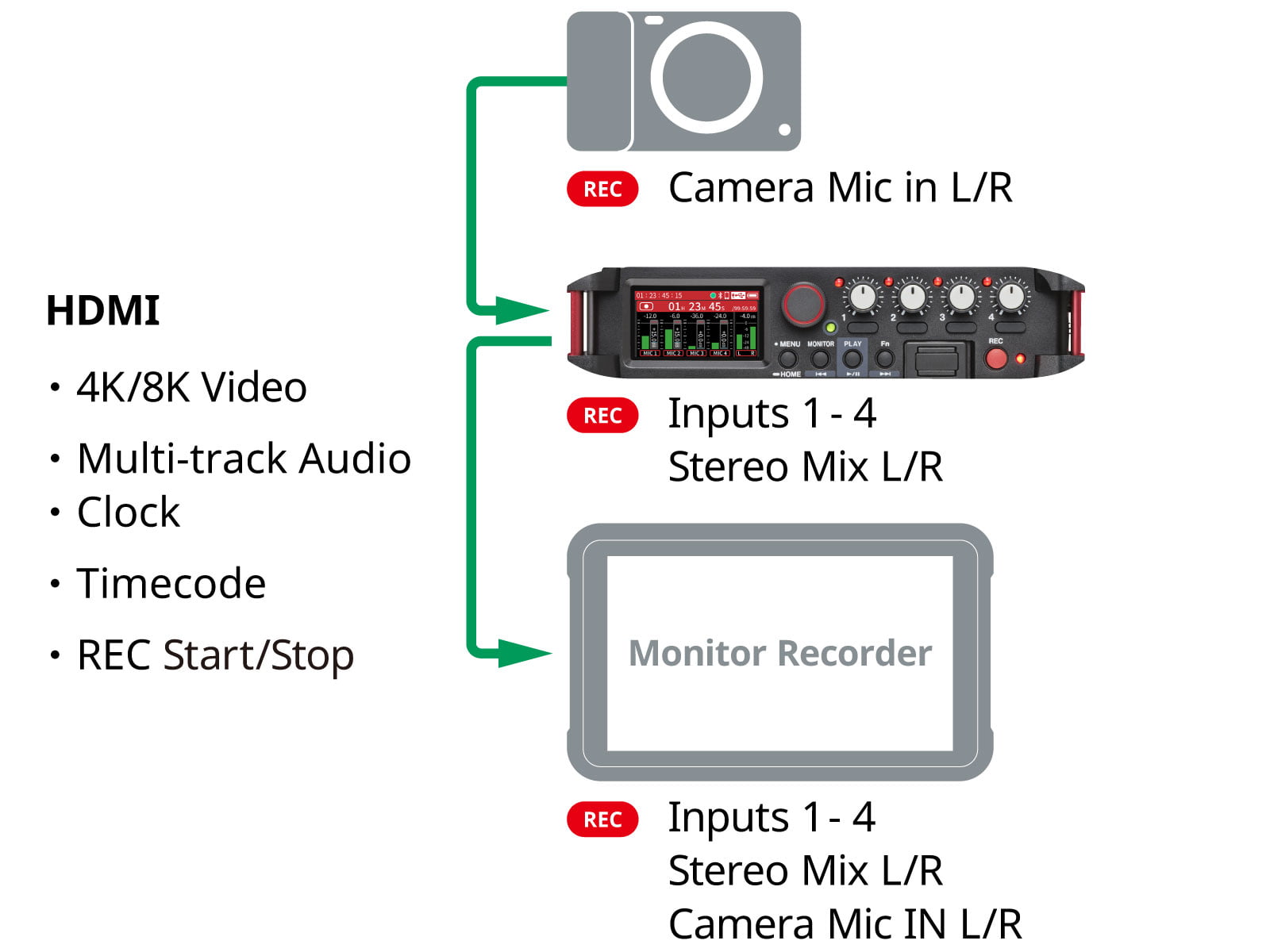 『FR-AV4』で収録した4チャンネル+ステレオミックスを本体録音しつつ、4K/8K映像信号とともにパススルー出力をしてモニターレコーダーで記録できます。カメラの音声もHDMI経由でパススルーされるためマルチトラック音声をモニターレコーダーに同時収録できます。