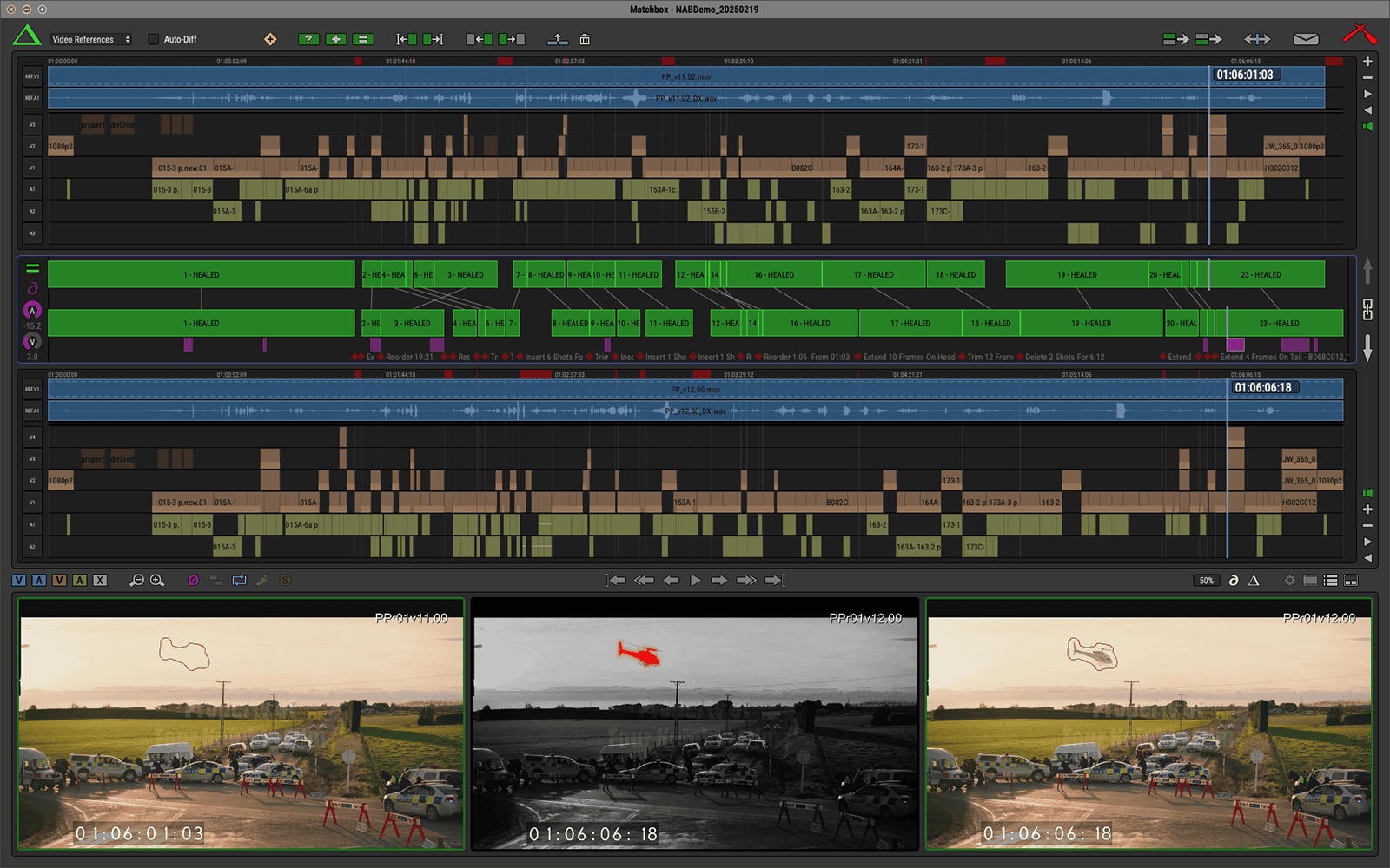 「Matchbox」は2つのバージョンが存在するリールやエピソードを比較して、カットの変更やVFXの微調整、セリフのズレ等を全て検出し、それらの相違点を明らかにします。そして損傷部分を報告したり、サウンドミックスやコンポジット作業、セリフや字幕、その他映像として作成されたあらゆるものをリタイムします。