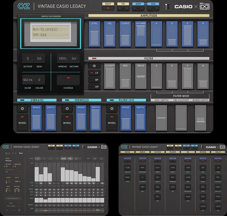 Vintage CASIO Legacyは、CZ、FZ、VZ、HZ、CTK、そしてRZという、それぞれが独自の個性と輝かしい歴史を持つ6つの独立した音源で構成されています。特筆すべきは、スイート全体をシームレスに操る専用の「Multi(マルチ)」エンジンです。6つの音源を自在に組み合わせ、高度なパフォーマンスを可能にする統合ワークステーションへと変貌させることで、現代の制作ニーズに完璧に応えます。