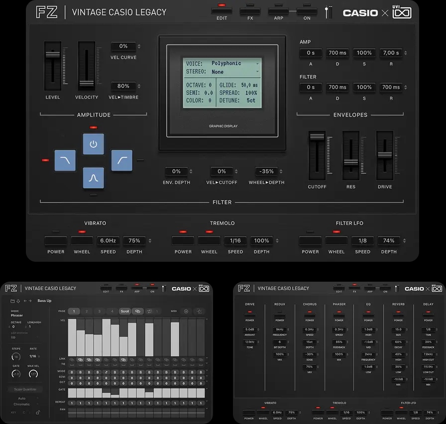 煩雑な操作は必要ありません。Vintage CASIO Legacyの各音源には、共通の設計思想に基づいた直観的なUIを採用しました。瞬時のサウンドメイクから、細部までこだわり抜く緻密なエディットまで、インスピレーションをダイレクトに音へと反映させる、表現力豊かな操作環境を提供します。