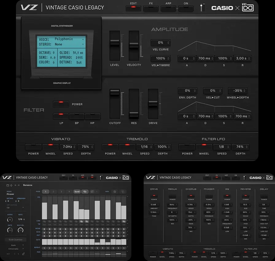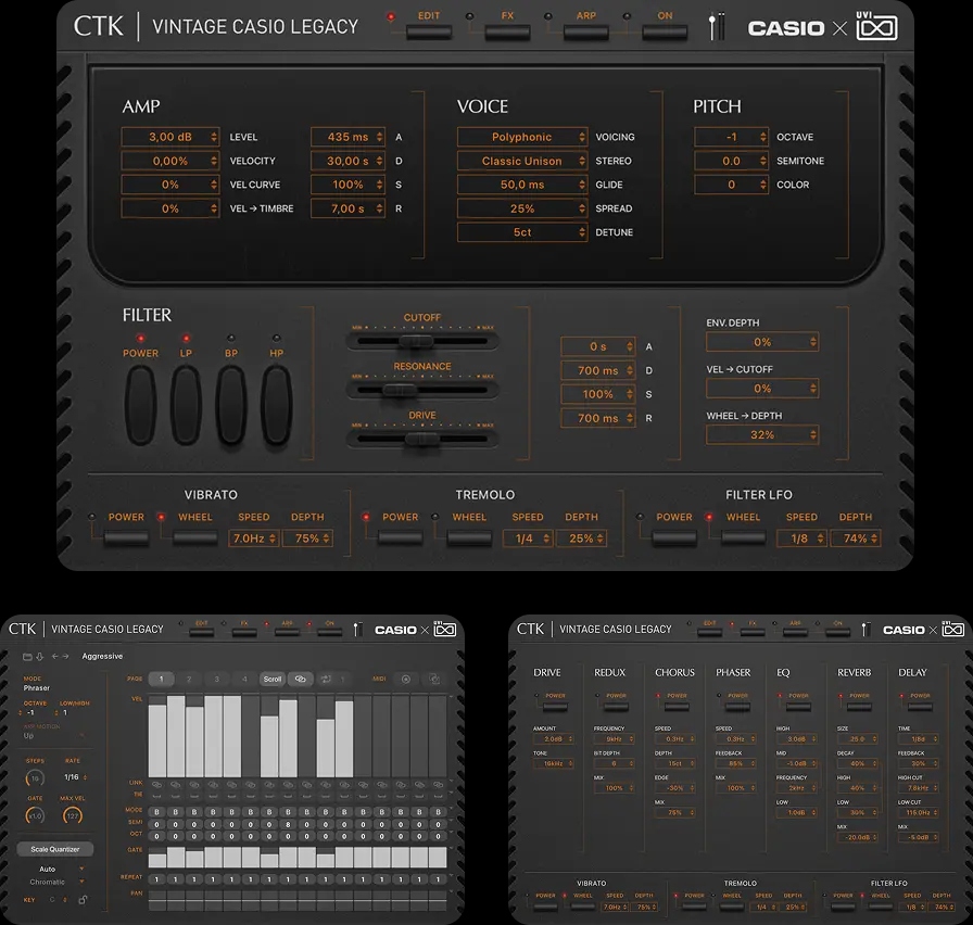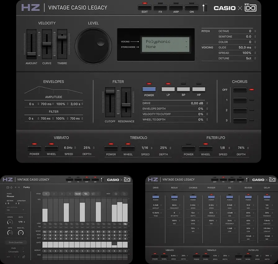 カシオはシンセサイザーの歴史において、極めて特異で重要な地位を占めています。革新的なデジタル楽器を世界中のミュージシャンの手に届け、電子音を真に「大衆化」させた先駆者だからです。Vintage CASIO Legacyは、実機の詳細かつ深いサンプリングを通じてその偉大な遺産を継承します。それは、これら象徴的なマシンが持つキャラクター、微細なニュアンス、そして特有の挙動を保存するための最も忠実な手法です。その結果、統合されたマルチエンジンを含む6つの音源スイートが誕生しました。オリジナルの真の魂を宿しながら、現代のクリエーターが求める柔軟性と即時性を兼ね備えています。