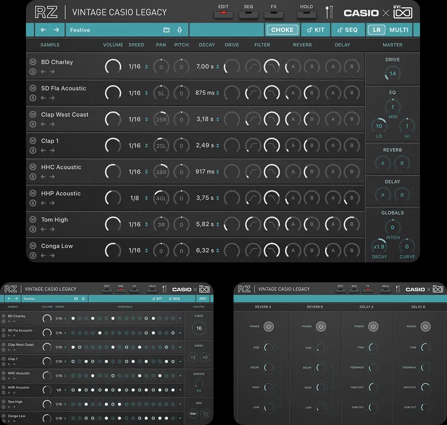 Vintage CASIO Legacyにのみ搭載された「Multi」モジュールは、収録されたすべての音源を一つの強力なパフォーマンス&制作のワークステーション型音源へと進化させます。象徴的なRZドラムエンジンに加え、本コレクション内の全音源から自由にアサインできる4つの独立したシンセスロットを統合。各スロットには専用のアルペジエーターとパフォーマンスコントロールを備え、個々のマシンの枠を超えた圧倒的なレイヤーとグルーブを構築可能です。