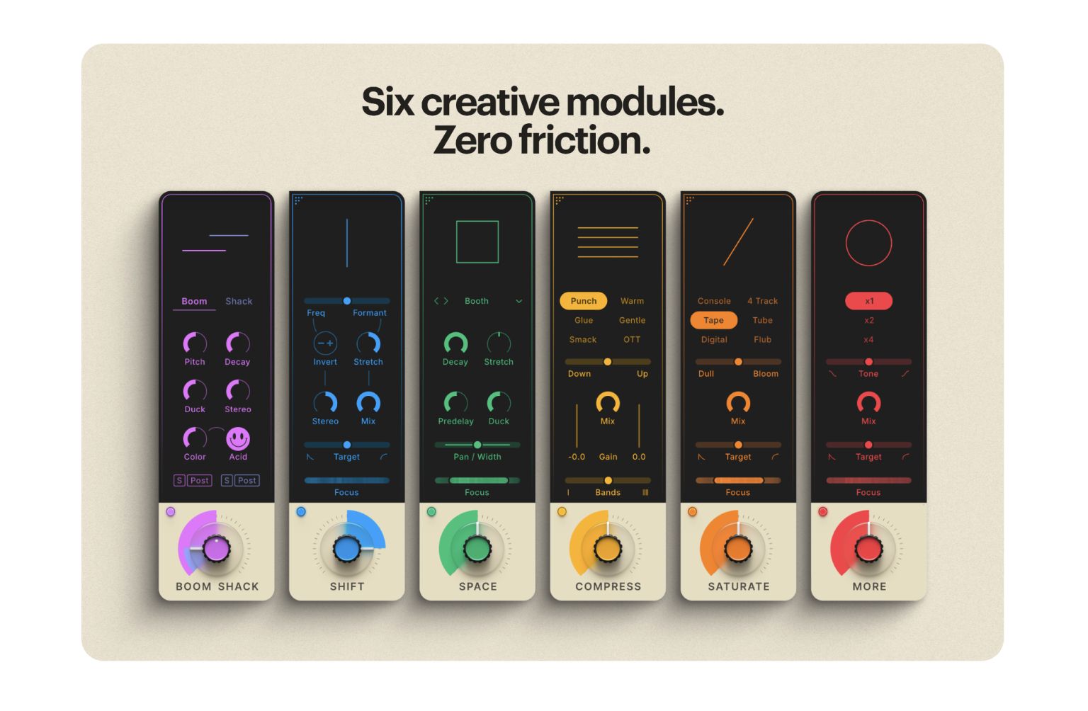 モジュールは、左から右へ順番にサウンドに影響を与えます。 Boom ShackとMoreモジュールはチェーンの最初と最後に固定位置がありますが、他の4つのモジュールは自由に並べ替えることができます。並べ替えるには、これらのモジュールの左上隅を掴んで目的の位置にドラッグします。設定によっては、順序を変えることで結果が大きく異なる場合があります。