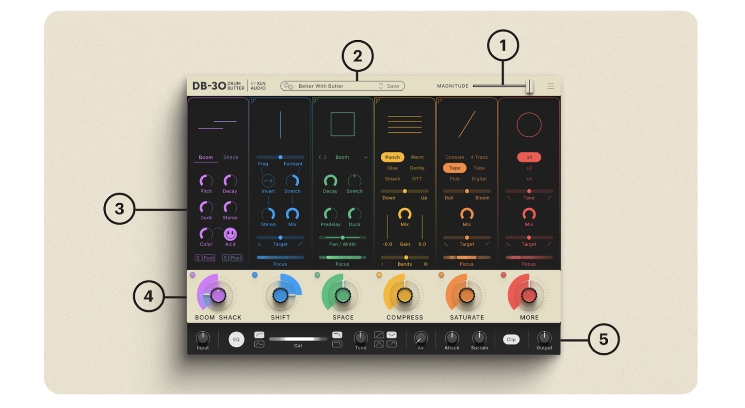 DB-30インターフェースの下部には、マスターセクションが設けられています。ここでは、入出力レベル、ハイパス / ローパスフィルター、様々なトーンオプション、そして強力なAirコントロールをグローバルにコントロールできます。また、ドラムヒットのトランジェントと長さを調節するAttackとSustainコントロールも配置されています。Attackコントロールは、歪みやコンプレッションが強すぎるサウンドで失われがちなパンチを補うのに最適です。これは、プロセッシングを施す前に、ドライサウンドのトランジェント部分をブレンドすることで機能します。