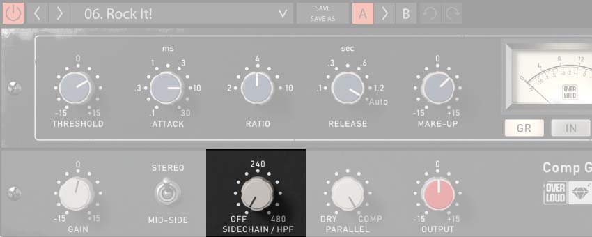 サイドチェーンのローカットフィルターを調整することで、低域に対するコンプレッサーの感度を下げることができます。これは、脈動する低域を多く含むオーディオプログラムの「ポンピング」効果の程度をコントロールするのに特に便利です。