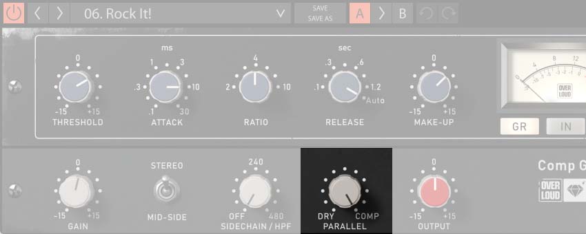 パラレル・コンプレッションは、トランジェントを損なわずにトラック全体のインパクトを向上させる強力なミキシング・テクニックです。コンプレッサーの出力を元のトラックに加算することで実現します。Comp Gを使えば、DAW内で複雑なルーティングを設定する必要はありません。パラレル・ノブを回すだけで操作できます。