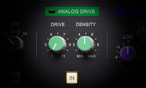 Analog Driveは、ミックスにグルーヴ感とパワーを加えるために設計された、独自の倍音エンハンスメント・プロセッサーです。DriveとDensityコントロールは連動して、アナログ回路にオーバーロードをかけることで、倍音の飽和と穏やかなコンプレッションを生み出します。微調整すれば滑らかな厚みのあるサウンドに、強めに調整すればよりアグレッシブで歪んだトーンが得られます。