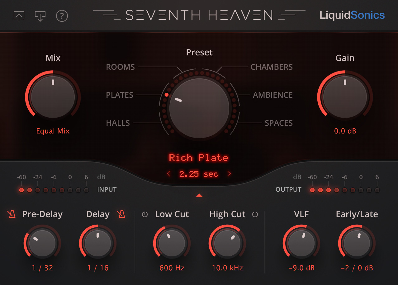 リバーブミックスのバランスをとる鍵は、反射とテールの相対レベルを変更する機能です。セブンスヘブンには、個別のリバーブエンジンと正確なアーリー/レイトリバーブダイヤルがあるため、完璧なリバーブを作成できます。