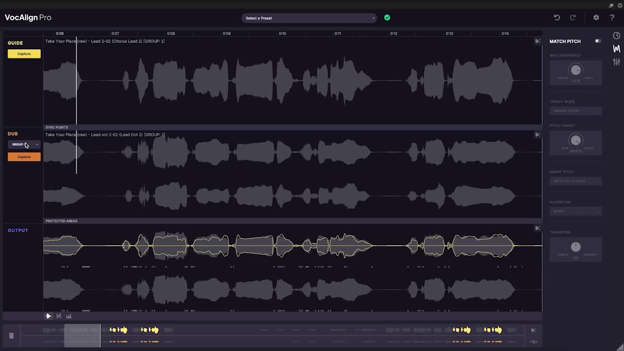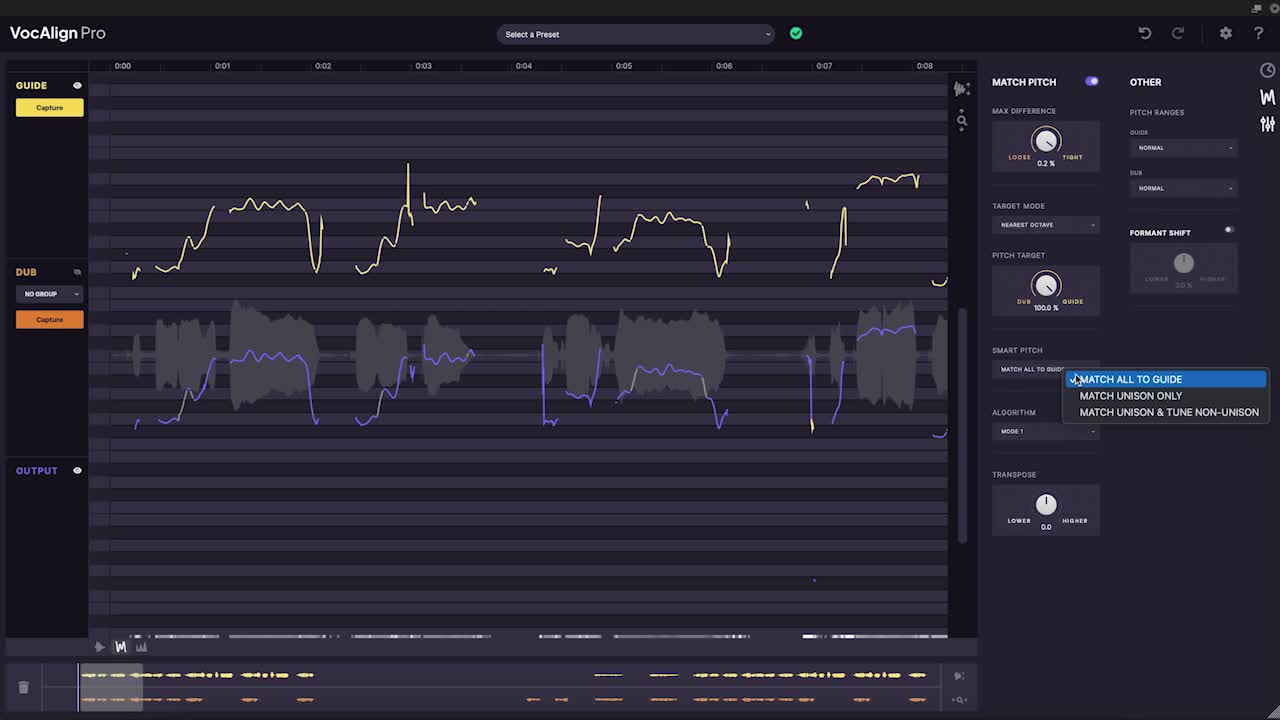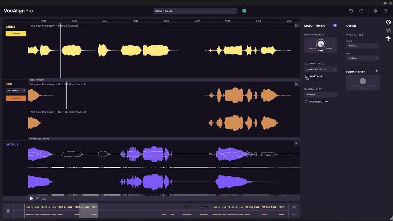ガイドのピッチにボーカルトラックを追従させることができるため、各トラックでピッチ補正を行う手間が省けます。また、Smart Pitchを使用すればバックコーラスをアライメントすることも可能です。