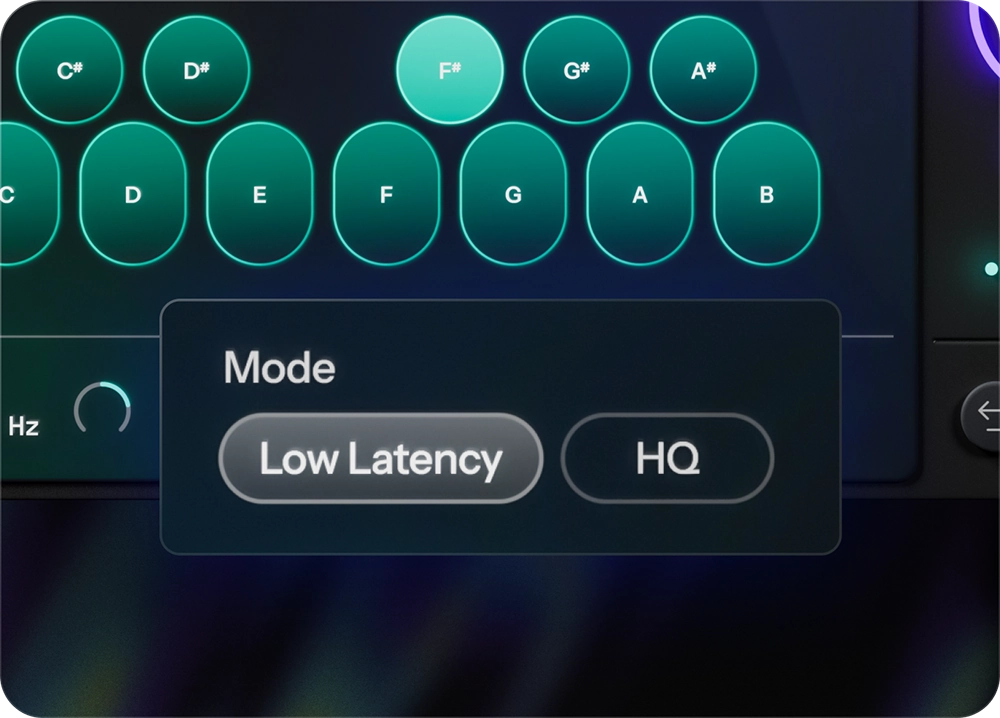 ライブパフォーマンスに最適な低レイテンシー(Low Latency)モードと、ミックスに最適な高音質(HQ)モードを瞬時に切り替え可能。シームレスなリアルタイム処理が、どんな状況でもあなたのインスピレーションに追従します。