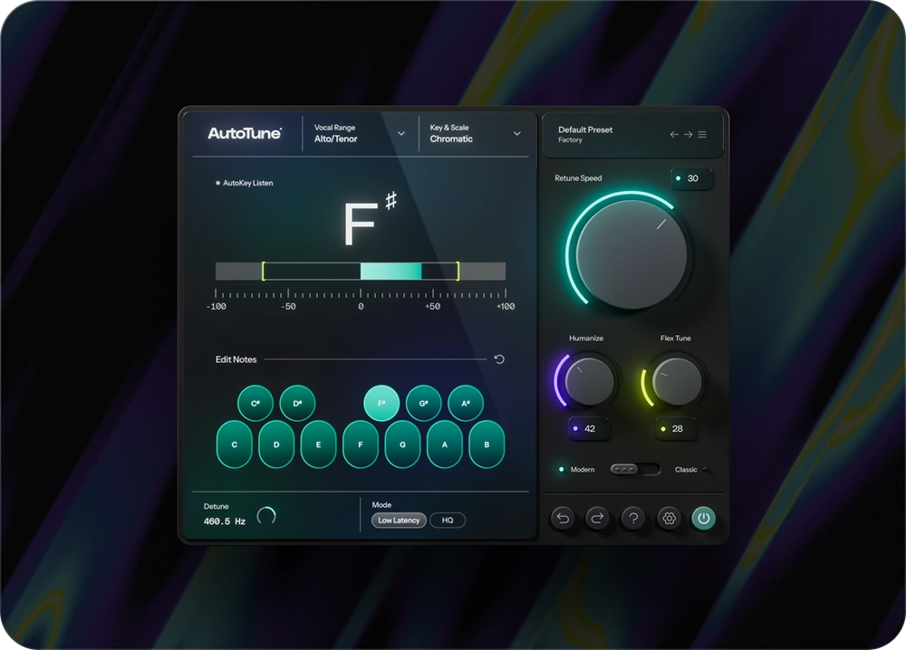 Classic Modeを選択すると、あのAutoTune 5のレトロな雰囲気を再現し、数十年にわたりポップミュージックを席巻してきた象徴的な「AutoTune効果」を実現します。より繊細な調整には、Modern ModeでFlex TuneとHQモードを使用し、ボーカルをより細かく制御できます。
