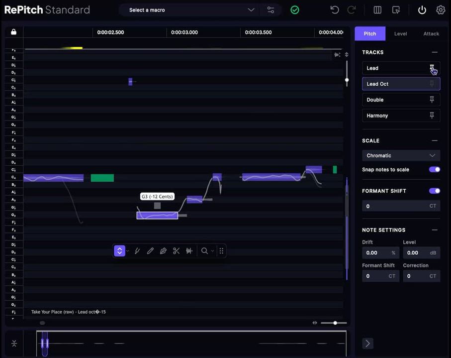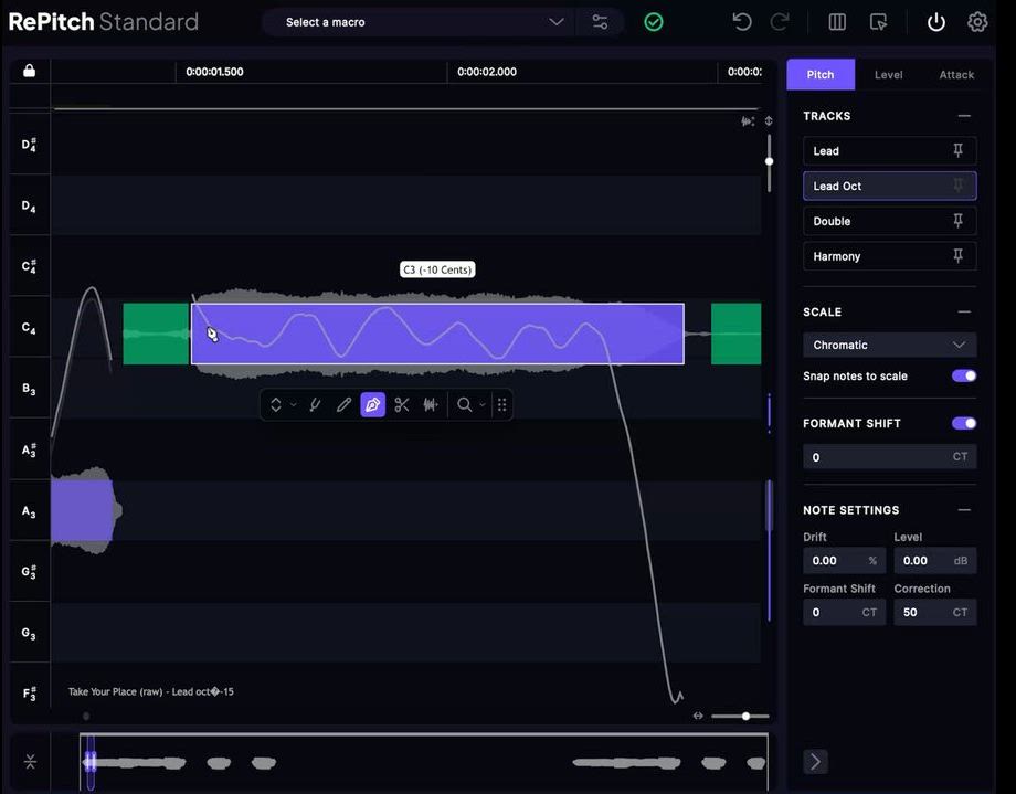 RePitchは、これまでにないほど自然なサウンド処理を実現しました。高性能なマクロ機能を用いた素早い自動処理や、精密なツールを用いた細かな手動補正が可能です。状況に合わせて柔軟に使い分けることで、音楽的で自然な仕上がりを実現します。
