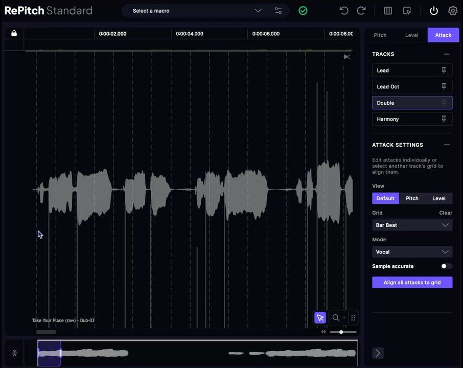 RePitch 2 Standardでは、革新的なツール「SmartAttack」を新搭載。ボーカルのフレージングを自動で検出し、グリッドに自然に合わせてくれます。パフォーマンスのニュアンスを損なうことなく、ノートの入りを自動で微調整してタイミングを引き締め、プロフェッショナルで洗練された仕上がりをこれまで以上に簡単に実現できます。