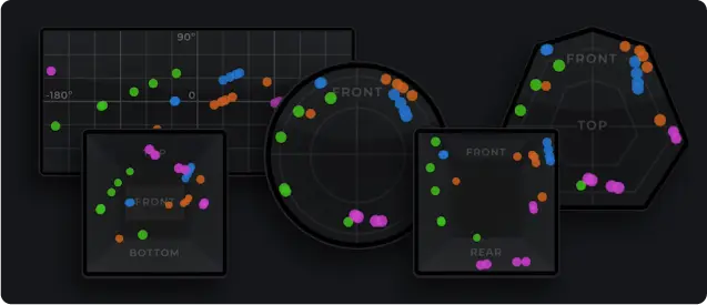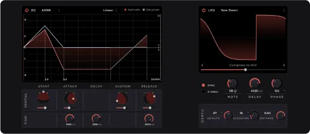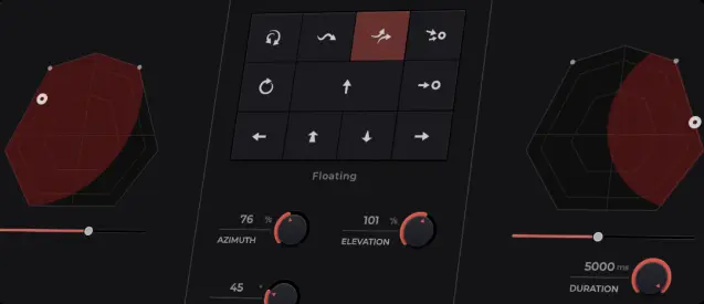 方位角と仰角を設定のうえ、後方から再生が始まり、中央へ持続、天井に放たれる音声も実現
