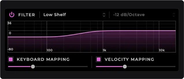 フィルターを鍵盤位置とベロシティに反応させて、表現力の高いダイナミックな演奏を実現