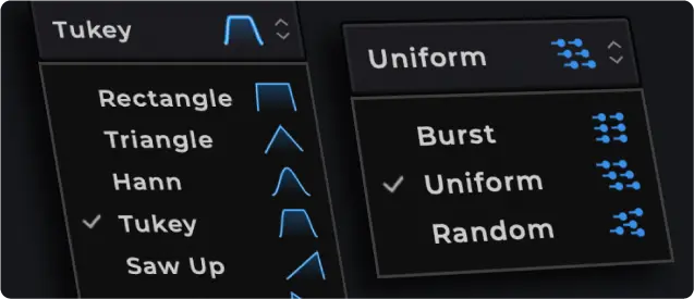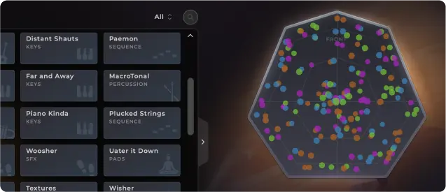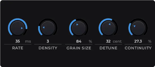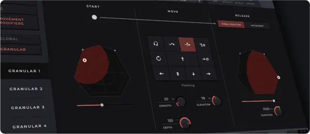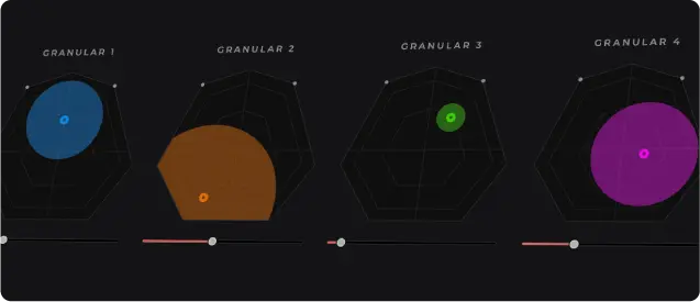 グレイン、すなわち音の粒子ひとつひとつが動き回り、豊かで変化に富んだ音声テクスチャーを生み出します。厳選されたサウンド・ライブラリを搭載しており、音楽やサウンドデザインに製品固有の質感を与えます。