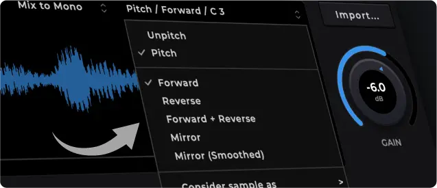 ピッチ変化のないグレイン生成や、オクターブ範囲を選択可能
