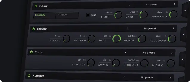 4つのFXスロットにはディレイ、リバーブ、EQ、その他のエフェクトを適用可能