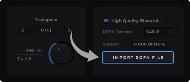 バイノーラル出力:付属のHRTFデータまたは自身のSOFAファイルを読み込んで使用