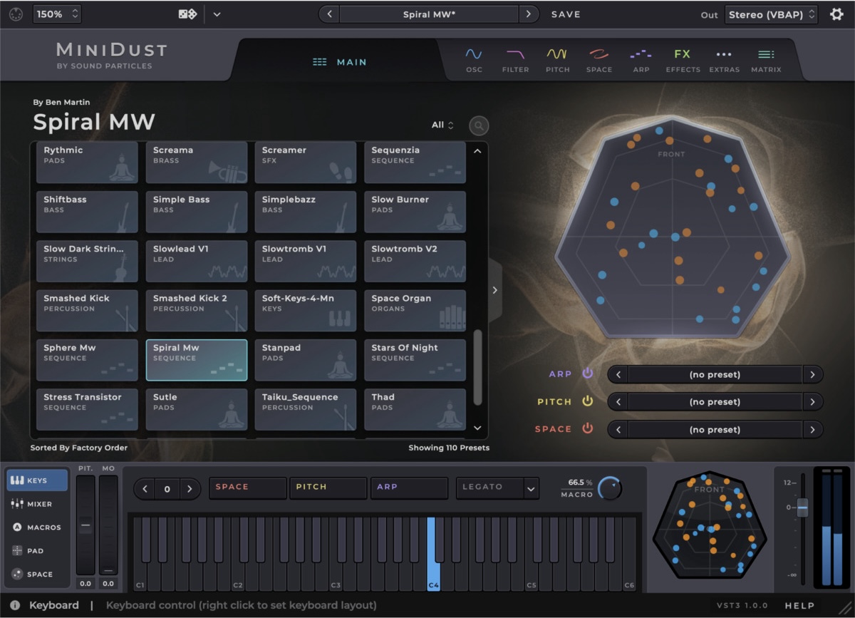 MiniDustは、2023年に発売されたプラグイン・シンセサイザー"SkyDust 3D"のライト版です。オシレーターの数を上位版の8から標準的な2基としながらも、サウンドの表現力はそのまま。同社製品の特徴である、直感的に操作可能な空間生成の仕様も変わりません。お求めやすい価格でありながらパワフルで、ユーザーのコンピューター環境や経験のレベルを問わないソフトウェア音源です。1音を鳴らすだけでも、即座に3Dサウンドを生成。出力は多数の"イマーシブ"なフォーマットに対応。ステレオ音像では素晴らしく、空間オーディオでは比類のない性能を発揮します。