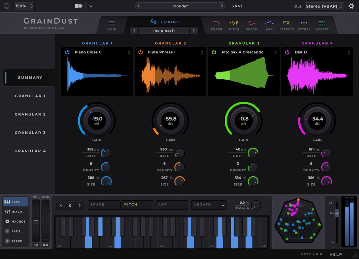 GrainDustは、完全に独立した4つのグラニュラー・レイヤーを備える、強力なプラグイン・シンセサイザーです。グレイン、すなわち音の粒子ひとつひとつが動き回り、豊かで変化に富んだ音声テクスチャーを生み出します。厳選されたサウンド・ライブラリを搭載しており、音楽やサウンドデザインに製品固有の質感を与えます。1音を鳴らすだけでも、即座に3Dサウンドを生成。出力は多数の"イマーシブ"フォーマットに対応。ステレオ音像では素晴らしく、空間オーディオでは比類のない性能を発揮します。