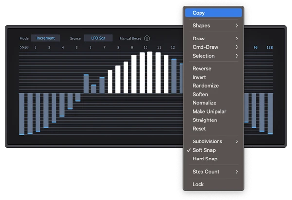 −100.00 〜 +100.00の範囲で最大128ステップの値を保持できる、テーブル型モジュレーション・ソースです。任意のパラメーターに対して、複雑で時間的な変化を正確にデザインできます。
