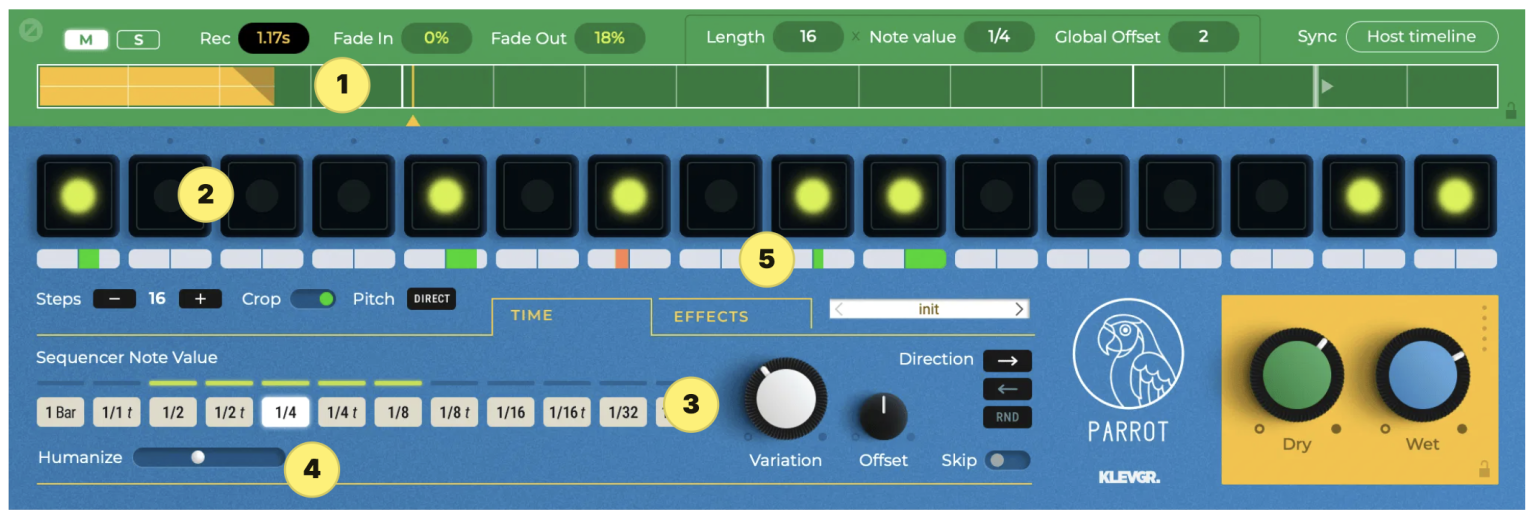 ループの長さ、ピッチ、バリエーション、ダイナミクス、フィルタリングを制御することで、Parrotは機械的なサウンドから、ワイルドで予測不可能な音へと変貌させることができます。その際も、常にオリジナルの音源とのつながりを保ち続けます。