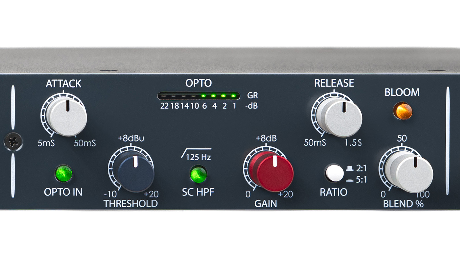 OPTO コンプレッサーは、可変アタック(5ミリ秒から)、リリース、スレッショルド、+20 dB のメイクアップ・ゲイン、そしてパラレル・ブレンド・コントロールで構成されています。レシオは 2:1 または 5:1 の設定が可能で、125 Hz S/C ハイパス・フィルターも用意されています。